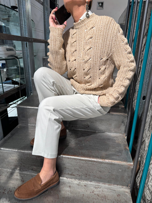 Maglia Girocollo Lana, Cashmere e Seta Treccia Iconica Scolpita